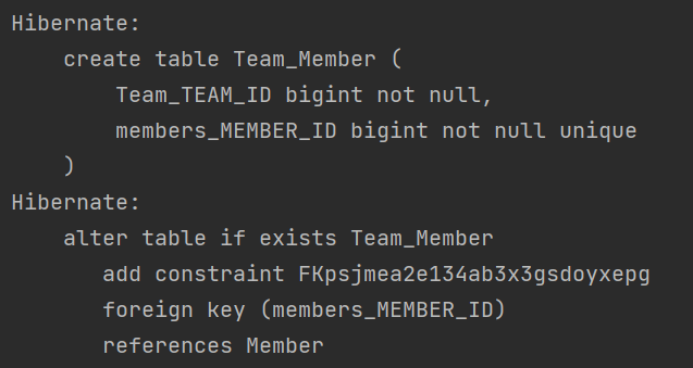 Member와 Team의 중간테이블 Team_Member가 생성되는 모습 일대다 단방향 매핑의 단점